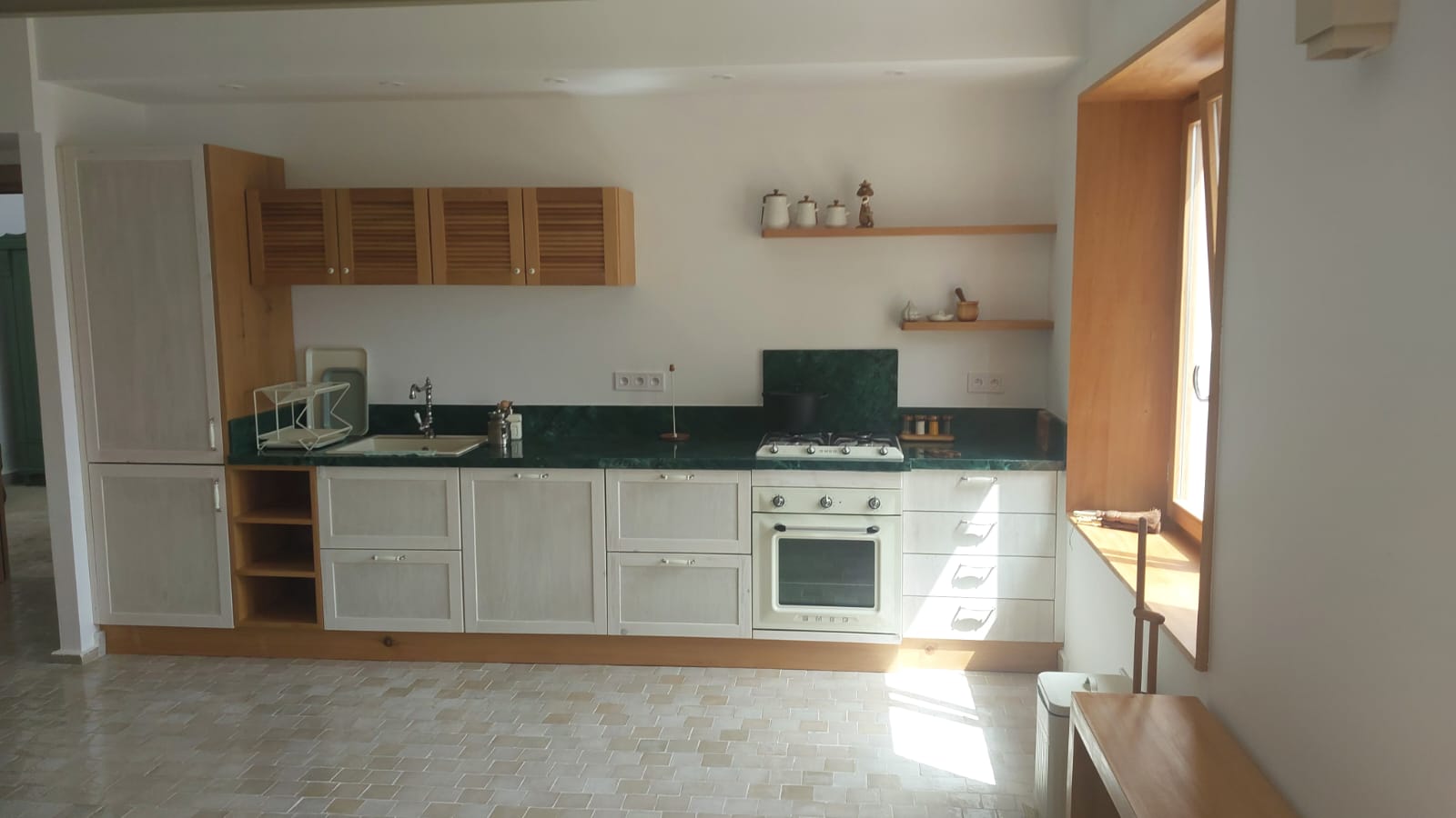 Le plan de travail en pierre naturelle structure l’ensemble et lui apporte profondeur et caractère, tandis que les rangements sur mesure optimisent chaque centimètre sans alourdir l’espace. Les étagères ouvertes et les façades travaillées soulignent une esthétique sobre, inspirée de l’art de vivre méditerranéen.
